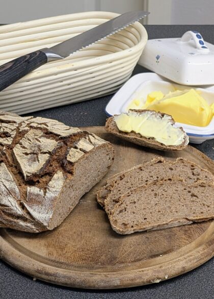 Ein kräftiges Mischbrot aus Roggen- und Weizenvollkornmehl, das durch lange Sauerteigführung besonders bekömmlich wird und eine herrliche Kruste entwickelt.