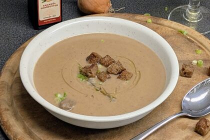 Cremige Esskastanien treffen auf feinen Weißwein und nussiges Arganöl – eine edle Suppe mit knusprigen Croutons für den besonderen Mittagsgenuss.
