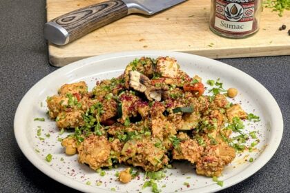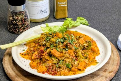 Ein orientalisch angehauchtes Phantasiegericht für 2 Personen, aus Süßkartoffeln, Porree und Couscous, veredelt mit Arganöl und Sieben-Gewürz.