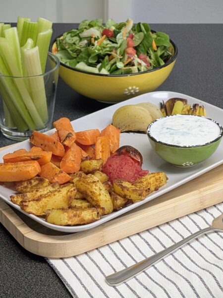 Ofen-Wedges mit Feldsalat, Karottensticks und Dip