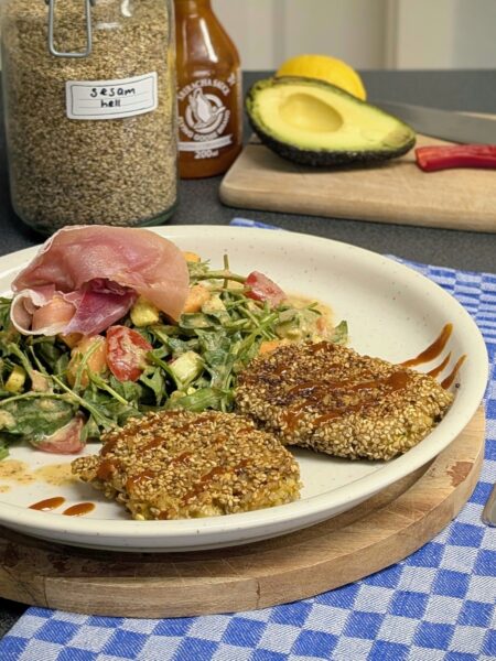 Knusprige Reis-Bratlinge auf Papaya-Rucola-Salat