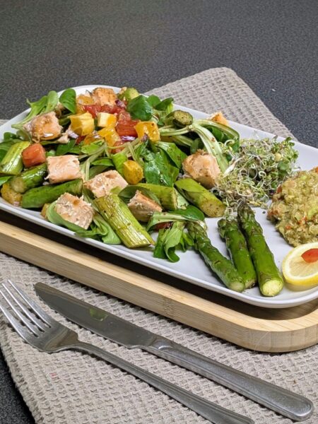 Wilder Lachs auf grünem Spargel & Avocado-Quinoa