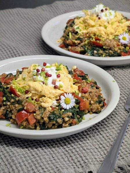 Bunte Spinatpfanne mit Buchweizen und Rührei