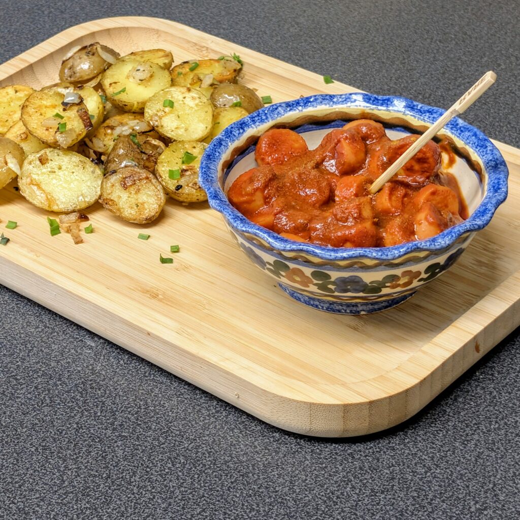 Ich mache das Ganze mit Wiener Würstchen. Die Soße selbst ist blitzschnell gemacht: Tomatenmark anrösten, mit Senf und Wasser ablöschen und dann mit reichlich Currypulver, Salz, Pfeffer und einer Prise Birkenzucker abschmecken. Die Wiener Würstchen in Scheiben schneiden in der Soße erwärmen – fertig ist das Currywurst-Glück!
