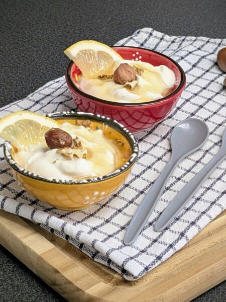 6. Auf zwei Schüsseln verteilen und mit den restlichen Mandarinenspalten sowie je einem halben Walnusskern dekorieren.