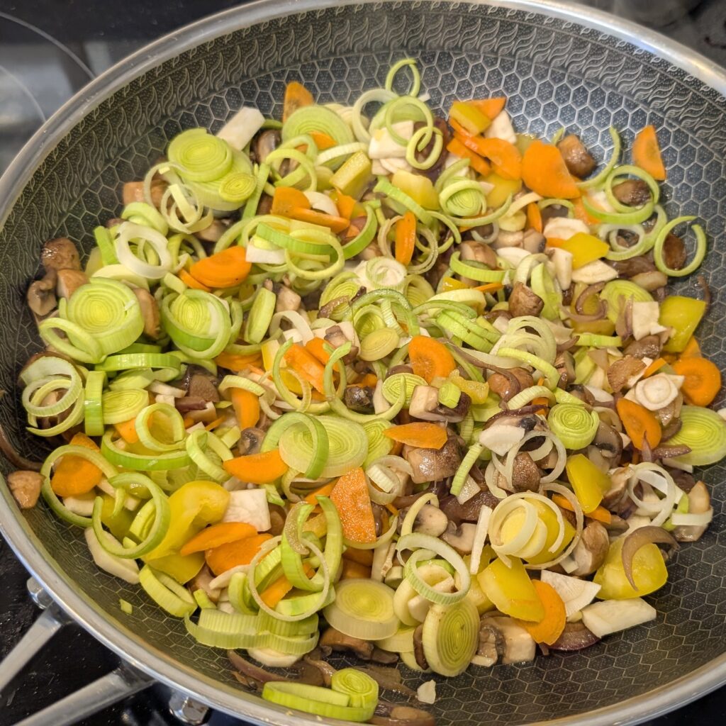 Mit ca. 100ml Wasser ablöschen. Sobald das Wasser verkocht ist, das Wurzelgemüse (Möhre, Pastinake) hinzufügen und kurz mit anrösten.