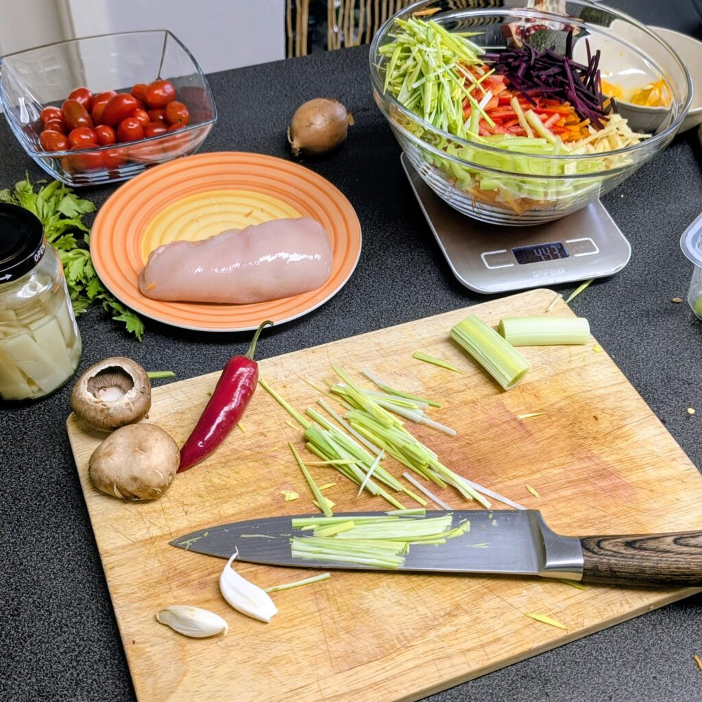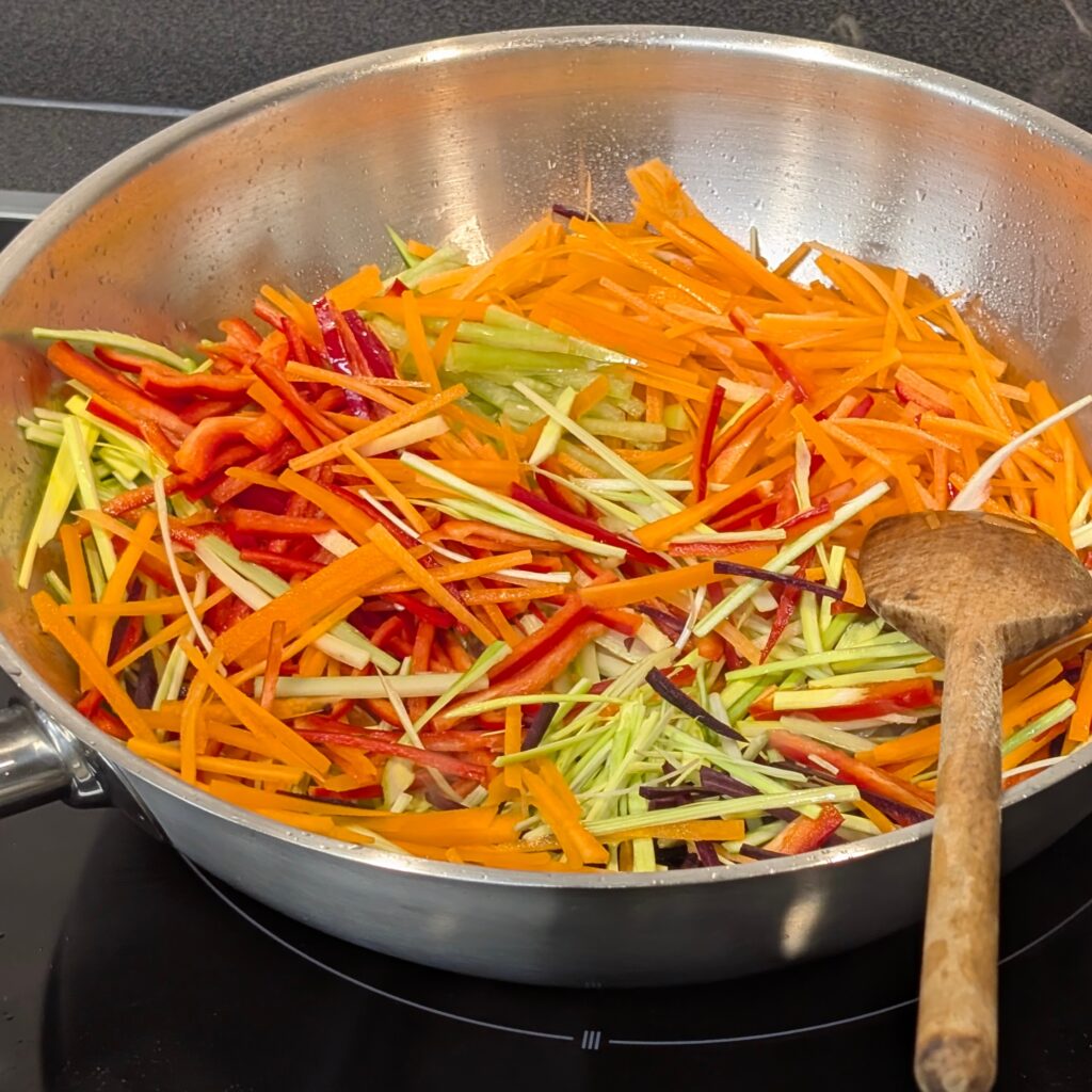 In meiner Küche wird es heute fast schon meditativ. Ich liebe ja asiatische Suppen, aber bevor der Wok überhaupt heiß wird, steht das „Schnibbeln“ im Fokus. Ich nehme mir die Zeit, Möhren, Paprika und Zucchini in hauchfeine, gleichmäßige Streifen zu schneiden – fast wie kleine Kunstwerke.