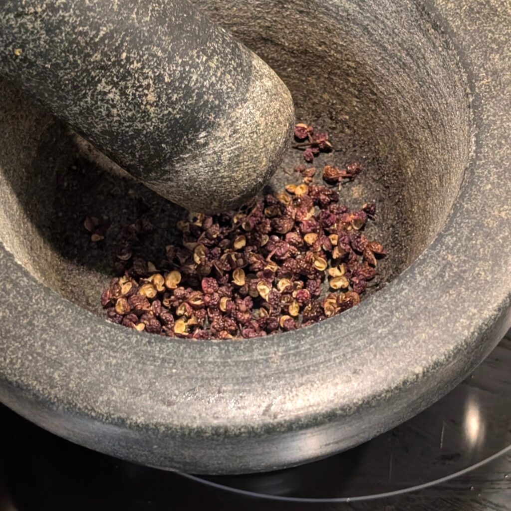 2. Rösten: Szechuanpfeffer im heißen Wok ohne Fett ca. 1 Minute rösten, dann im Mörser fein zerstoßen.