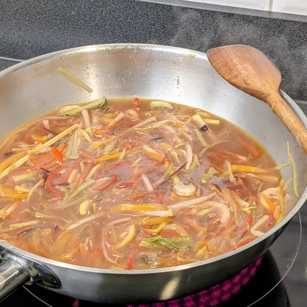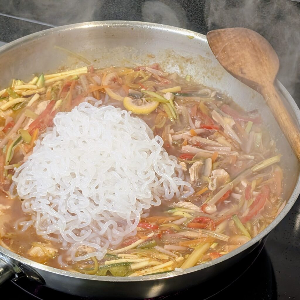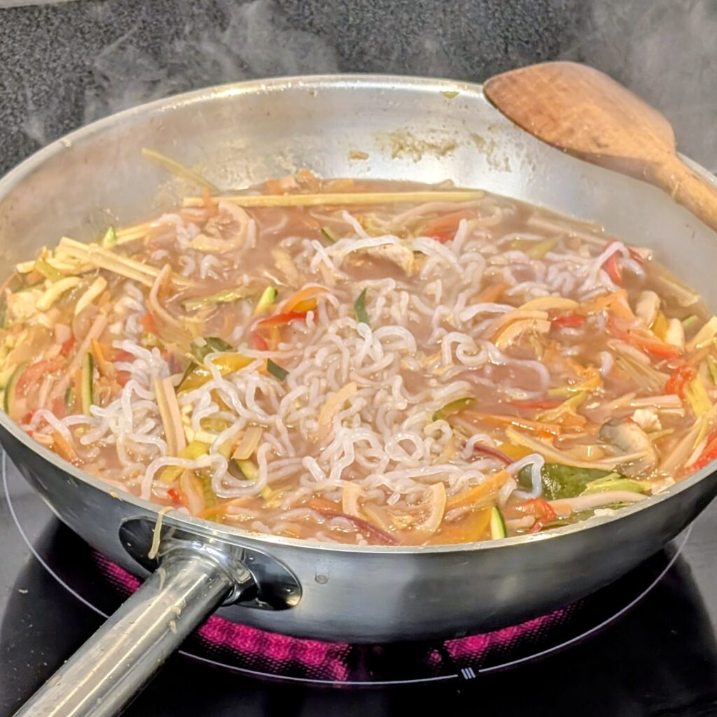 7. Finale: Konjaknudeln 2-3 Mal abspülen, zur Suppe geben und 1 Minute mitwärmen.