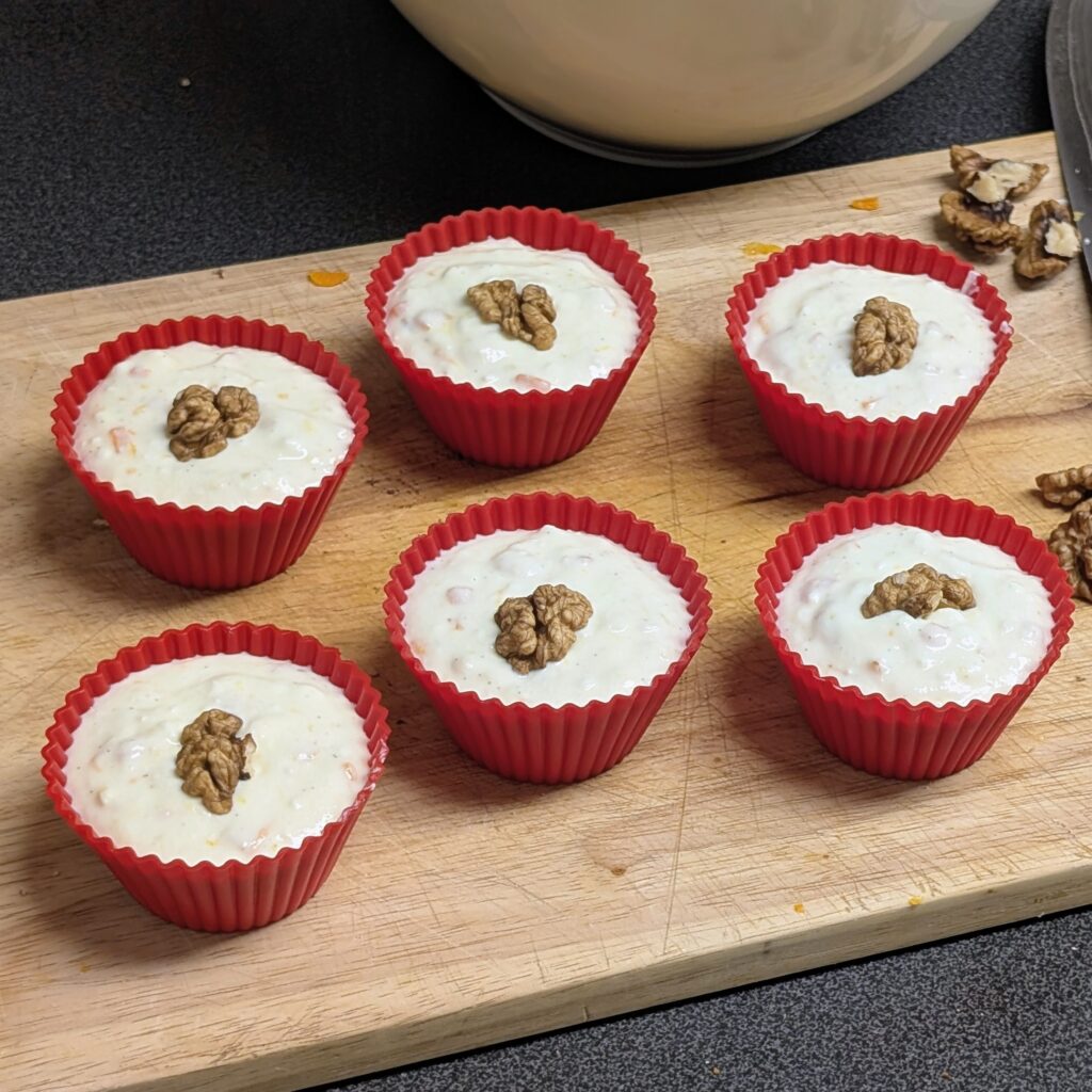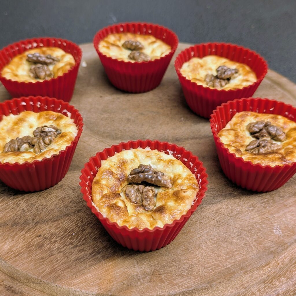 Die Basis aus Quark und körnigem Frischkäse macht die Küchlein herrlich leicht und proteinreich. Durch den untergehobenen Eischnee werden sie im Ofen wunderbar fluffig, fast wie kleine Soufflés. Das Beste: Sie kommen ganz ohne Boden aus! Das spart Zeit und macht sie zu einem tollen Low-Carb-Snack. Als krönenden Abschluss bekommt jedes Küchlein eine halbe Walnuss verpasst – der herbe Crunch passt perfekt zur cremigen Vanille-Note. Ich genieße sie am liebsten, wenn sie noch ganz leicht lauwarm sind.