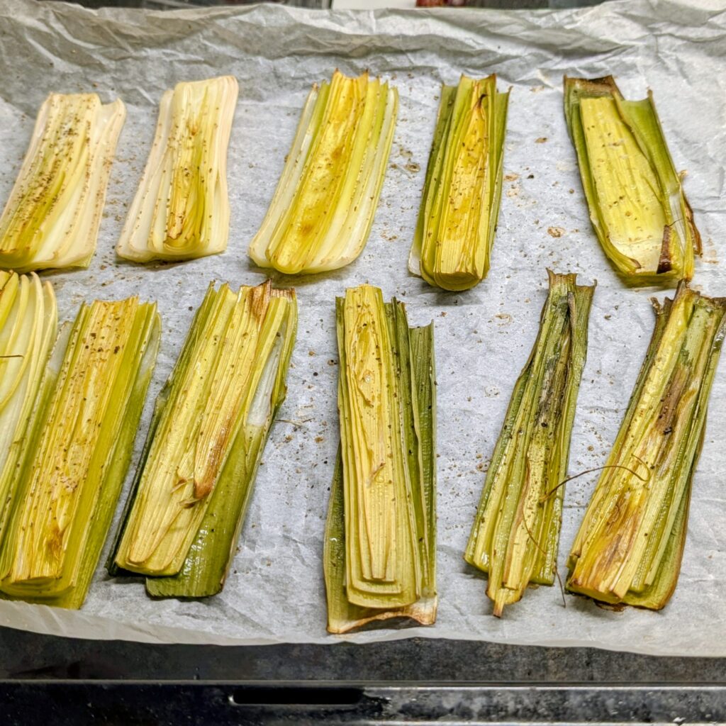 Lauch garen: Porree putzen, dritteln, längs halbieren und auf ein Blech legen. Salzen, pfeffern, mit Öl besprühen und bei 200 °C Ober-/Unterhitze ca. 10–15 Min. weich garen.