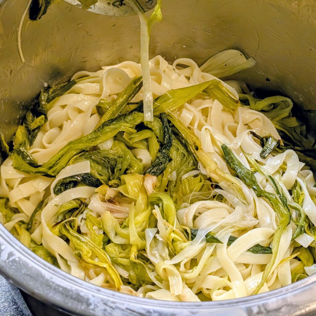 Finish: Den weichen Porree mit einer Gabel in feine Streifen „kämmen“. Mit den abgegossenen Nudeln und der Soße vermengen.