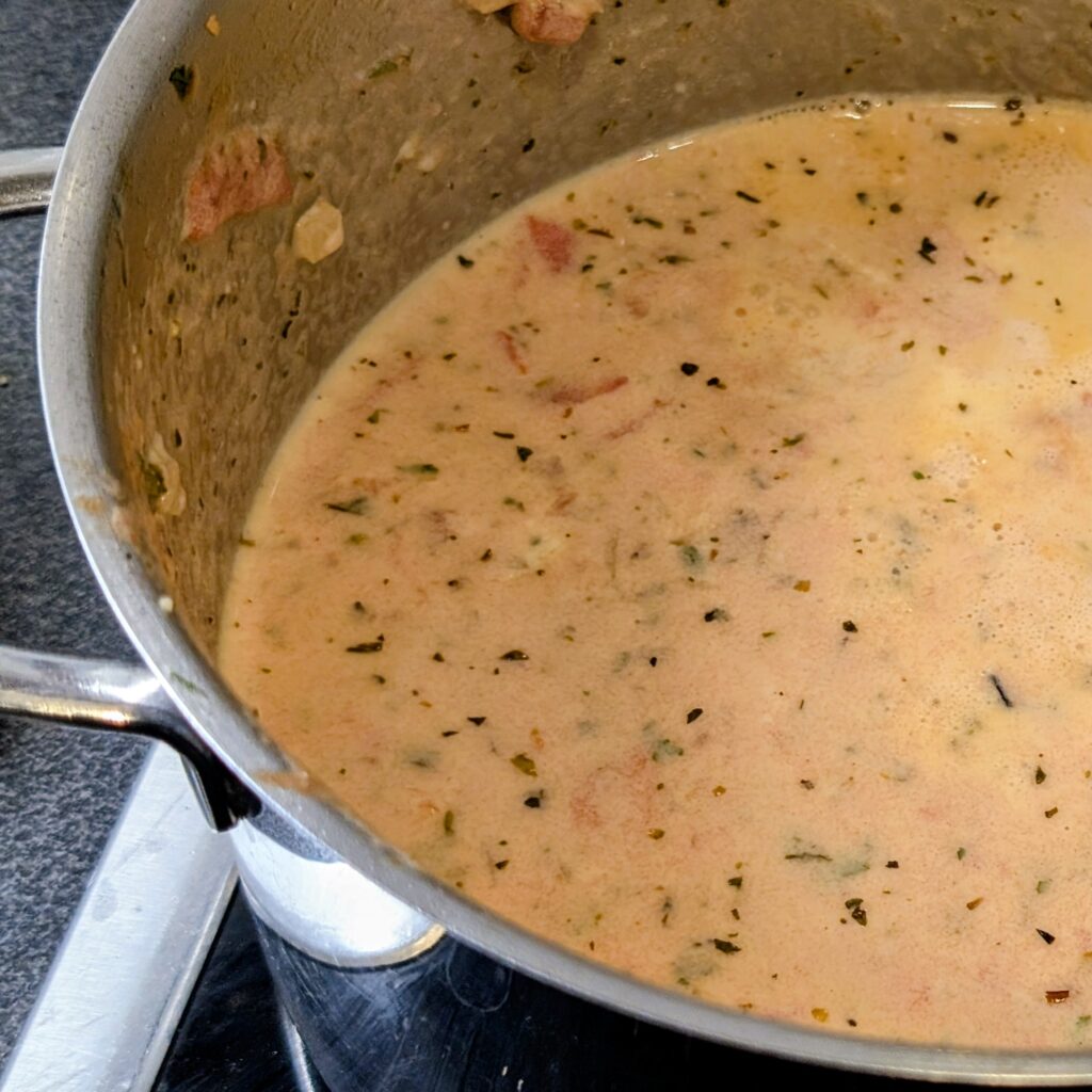 Cremige Soße: Zwiebel und Knoblauch fein würfeln, in Öl anschwitzen. Tomatenwürfel zugeben, kurz anrösten und mit Sahne auffüllen. Kräuter und Gewürze zufügen. Mozzarella würfeln, einrühren und sanft schmelzen lassen.