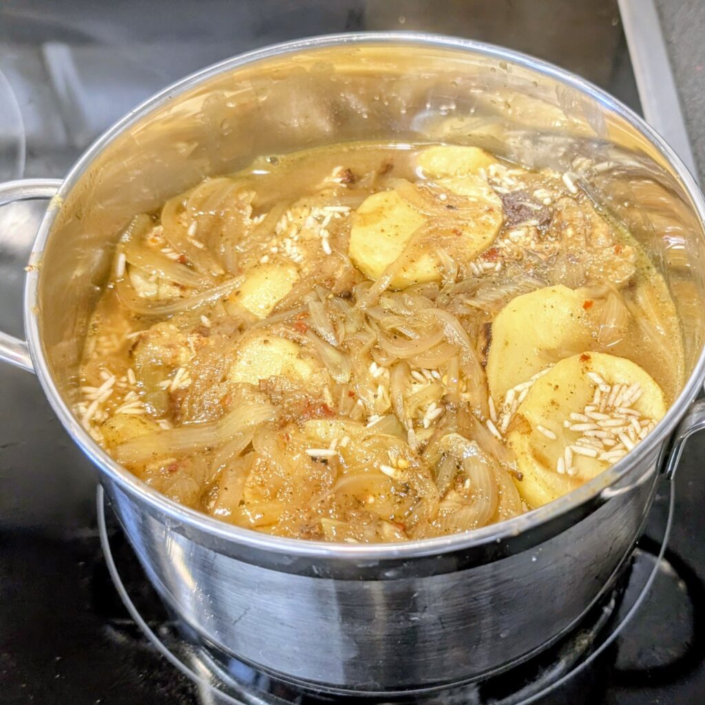 Hähnchenschenkel von der Haut befreien und in 2 EL Ölivenöl scharf anbraten, Zwiebeln kurz mitdünsten. Mit Wasser und dedn Gewürzen aufgießen und 20 Minuten köcheln. Danach Fleisch vom Knochen lösen, Brühe auffangen.
