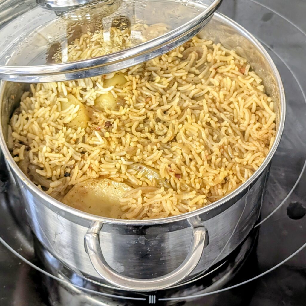 Zugedeckt auf kleiner Flamme 25 Minuten köcheln, bis der Reis gar ist. Danach 10 Minuten ruhen lassen.