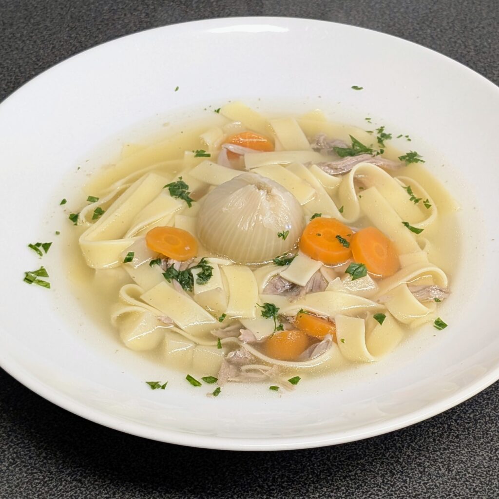 Nachdem die Brühe gut 2 Stunden geköchelt hat, ist das Fleisch butterweich. Den Eintopf baue ich dann ganz klassisch auf: Ausgelöstes Putenfleisch und das gewürfelte Suppengemüse zurück in die Brühe. Die Bandnudeln koche ich separat in Salzwasser, um die Brühe nicht zu sehr mit Stärke zu binden, und gebe sie erst am Ende hinzu.