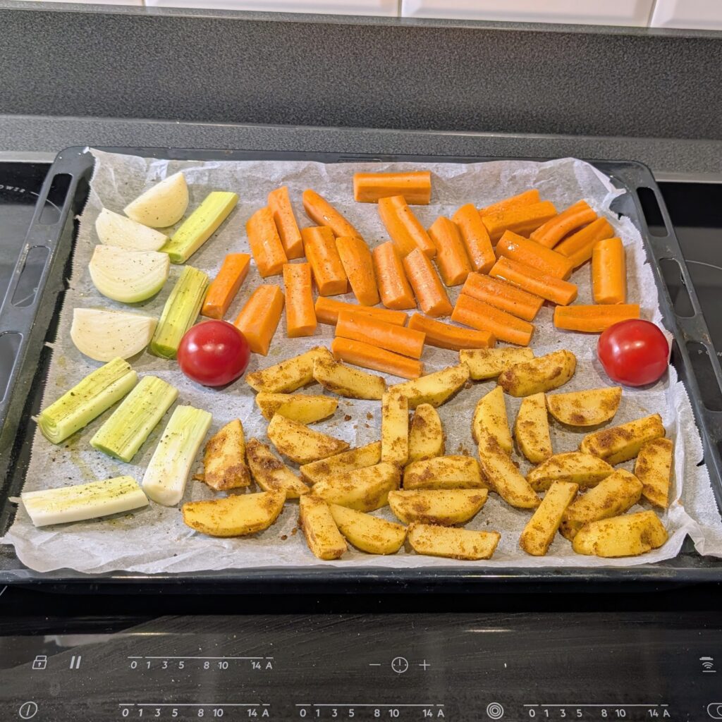 Backen: Den Ofen auf 200 °C Umluft vorheizen. Ein Backblech mit Backpapier auslegen. Gemüse und die ganzen Tomaten darauf verteilen, mit Olivenöl (idealerweise aus der Sprühflasche) benetzen und würzen. Die Kartoffeln dazugeben und alles ca. 20 Minuten garen, bis die Kartoffeln weich und die Möhren noch bissfest sind. Nach der Hälfte der Zeit einmal wenden.