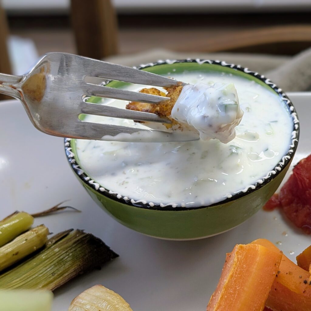 Während das Gemüse auf dem Blech röstet, sorgt der Sellerie im Glas für den nötigen Crunch und Frische-Kick. Der Dip aus Saurer Sahne und Kefir ist eine leichtere, proteinreichere Alternative zum klassischen Tzatziki und harmoniert wunderbar mit den warmen Karottensticks.