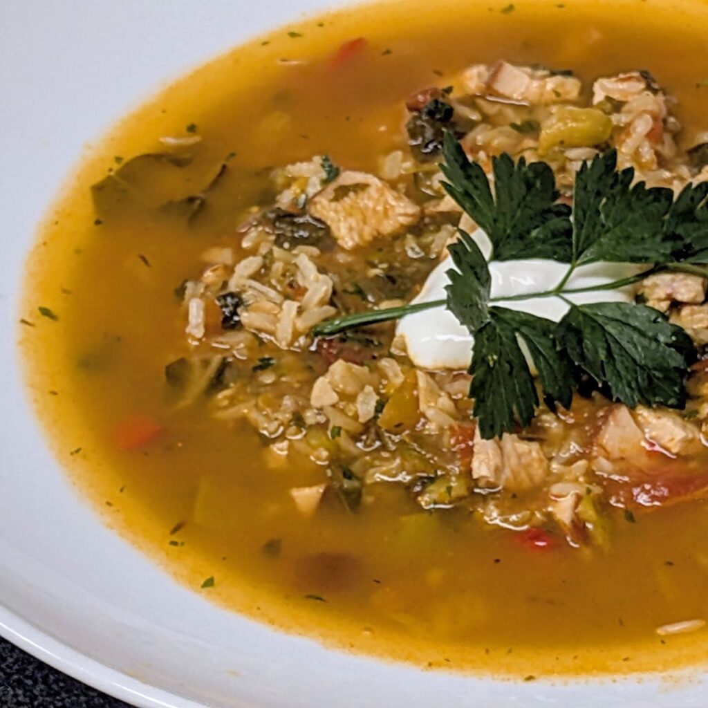 Hühnerbrust Kasseler Art würfeln und zum Eintopf geben.