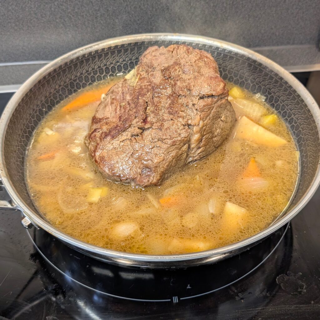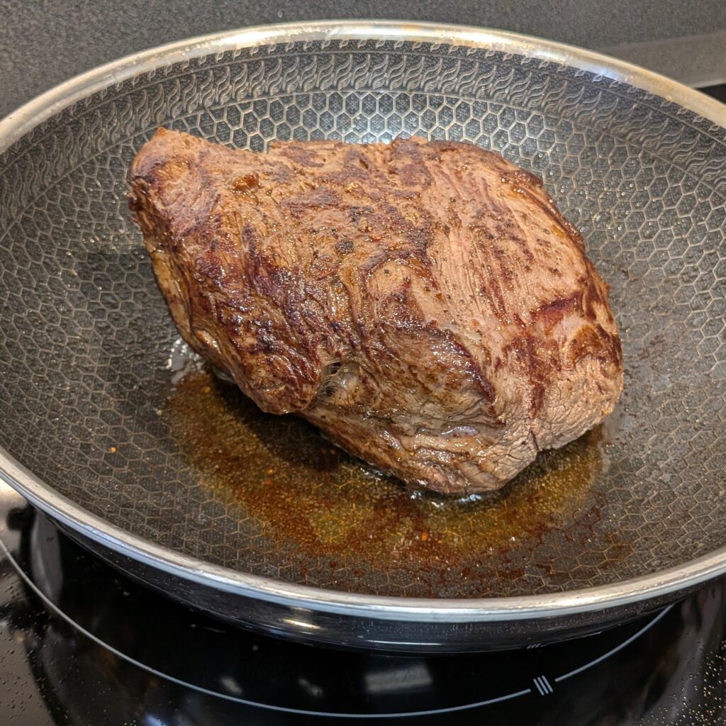 Letztens habe ich eine 1 kg schwere Rinderlende zubereitet – ganz klassisch mit Suppengemüse angebraten. Da auch die Kleinen mitgegessen haben, habe ich komplett auf Rotwein verzichtet und stattdessen zwei volle Gläser kräftigen Rinderfond verwendet. Das Ergebnis war eine wunderbar milde, aber tiefgründige Sauce, die ich am Ende nur leicht mit etwas Kartoffelstärke gebunden habe.