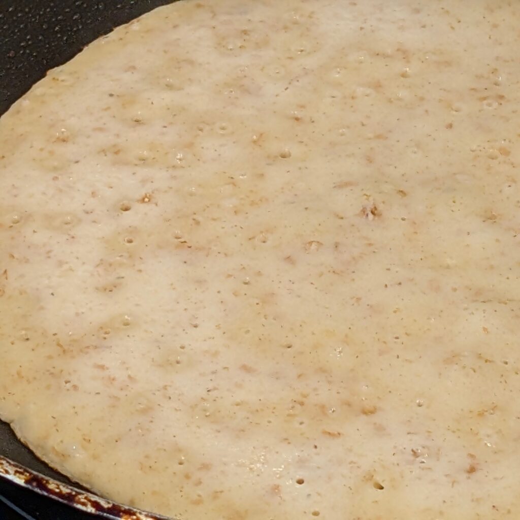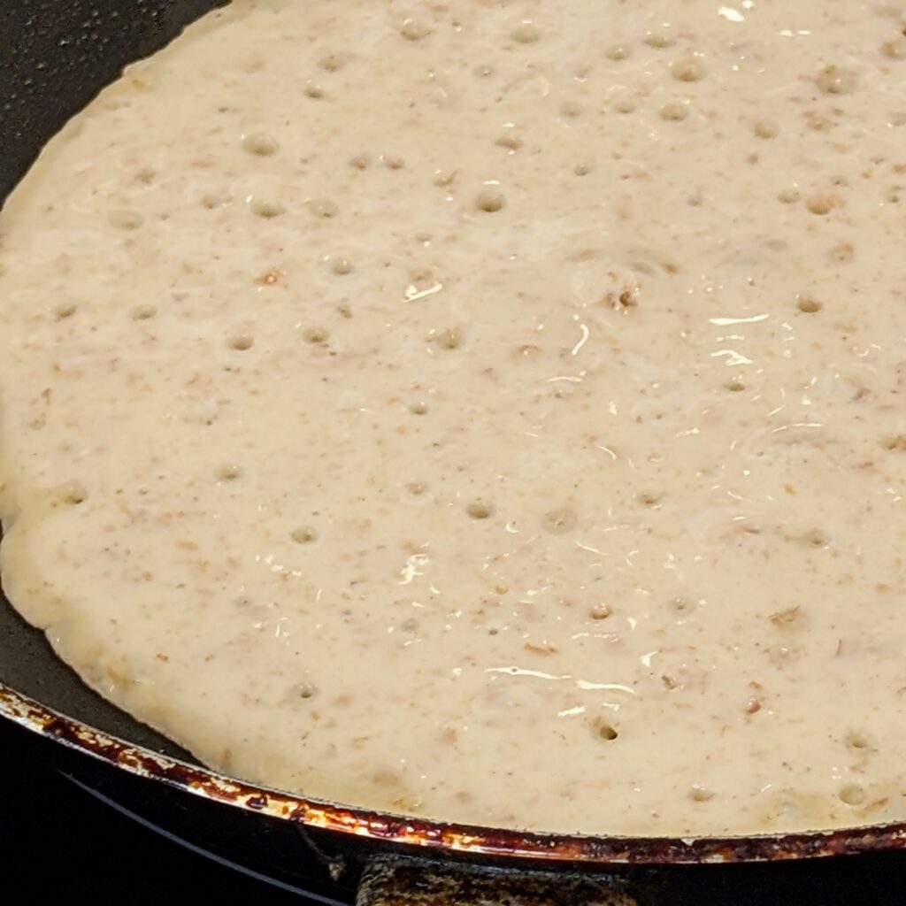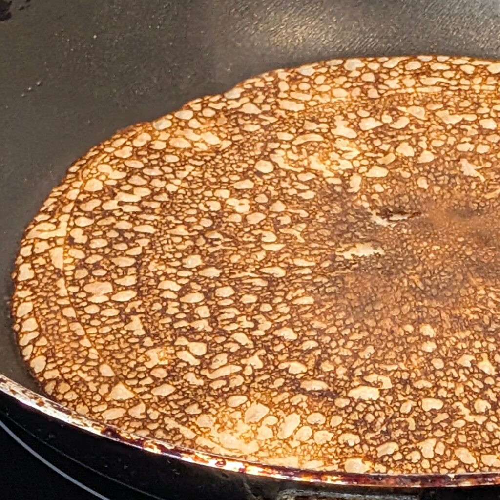 Wenn die Plinse an der Oberfläche nicht mehr glänzt (dauert ca. 1-1,5 Minuten), wird sie gewendet. Das kannst du mit einem kräftigen Schwung erledigen, besser aber, du nimmst einen Pfannenwender.