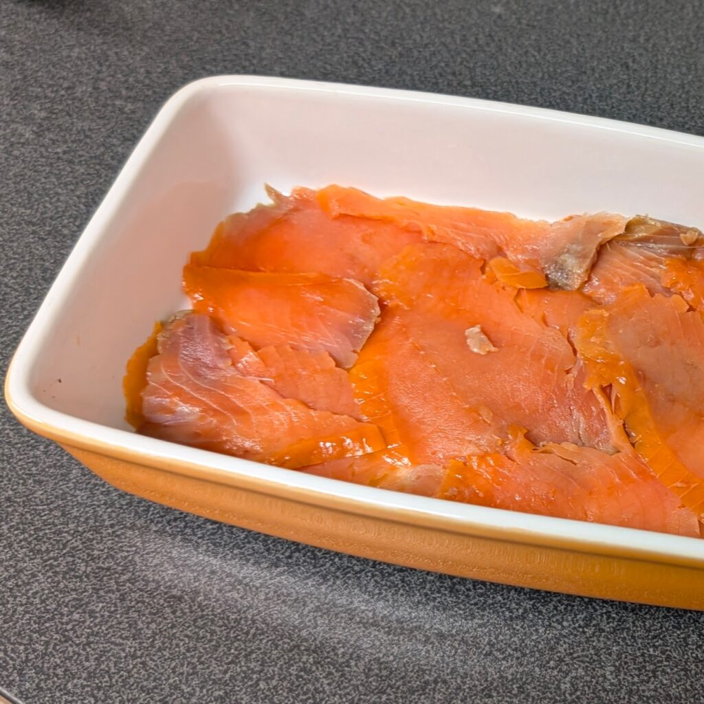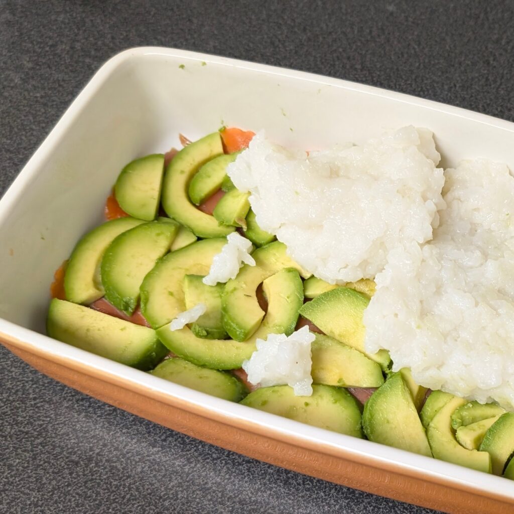 Eine schmale Auflaufform (etwas kleiner als A5) mit dem Lachs auslegen. Darauf die in Scheiben geschnittene Avocado verteilen und zum Schluss mit dem kalten Reis auffüllen. Alles fest andrücken.