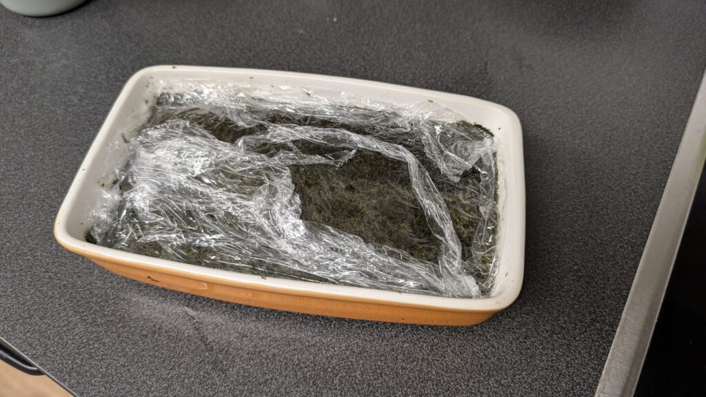 Die zwei Nori-Blätter obenauf legen (Überlappungen mit feuchten Fingern fixieren). Mit Folie abdecken und für 2–3 Stunden (oder über Nacht) kalt stellen.