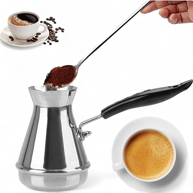 Das Briki ist ein kleines, meist kupfernes oder messingfarbenes Kännchen mit langem Stiel, das speziell für die Zubereitung von türkischem Kaffee konzipiert ist. Seine bauchige Form unten und die eng zulaufende Öffnung oben sind ideal, um den feinen Kaffeesatz zu sammeln und den charakteristischen Schaum zu bilden. Es wird direkt auf dem Herd erhitzt und ist für die traditionelle, langsame Kaffeezubereitung unerlässlich.