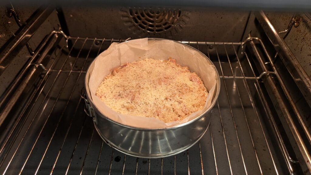 Mit geriebenem Bergkäse bestreuen. Im vorgeheizten Ofen bei 200°C (Ober-/Unterhitze) für 40–45 Minuten backen.Bei Bedarf für eine extra Kruste die letzten 1–2 Minuten die Grillfunktion zuschalten.