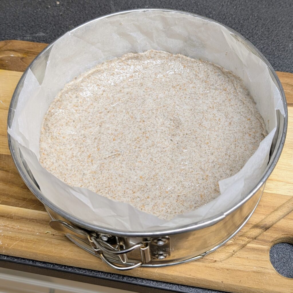 Den Sauerteig in eine kleine, mit Backpapier ausgelegte Springform geben. Mit einem angefeuchteten Löffel gleichmäßig verstreichen und einen kleinen Rand hochziehen. Den Teig für ca. 1 Stunde an einem warmen Ort ruhen lassen.