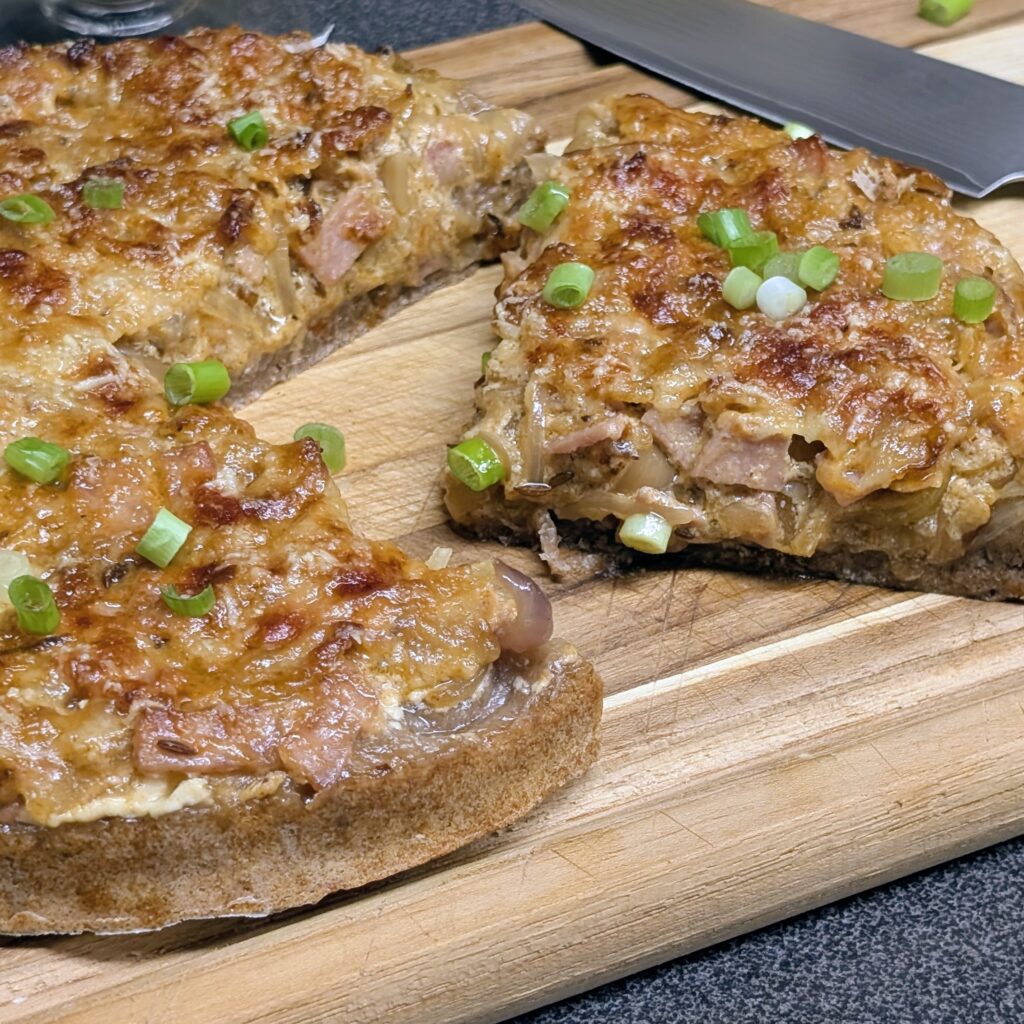 Dieser Zwiebelkuchen kommt ganz ohne Hefe-Zusatz aus und besticht durch die feine Säure des Vollkorn-Sauerteigs. Die Füllung ist eine wunderbare Mischung aus goldbraun gedünsteten Zwiebeln, magerem Schinken und einer Prise Rauchpaprika, die dem Ganzen ein tolles Aroma verleiht.