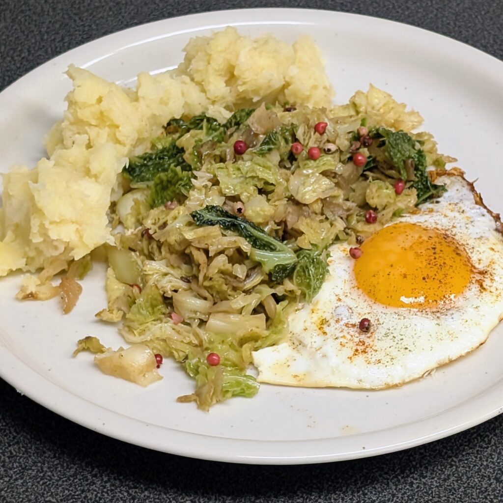 Sobald der Kohl fertig ist, wird er aufgeteilt: Die eine Hälfte geht in dien Kühlschrank und wartet dort für die Krautnudeln von morgen. Da muß ich den Kohl – während die Nudeln kochen – nur noch einmal kurz erwärmen.